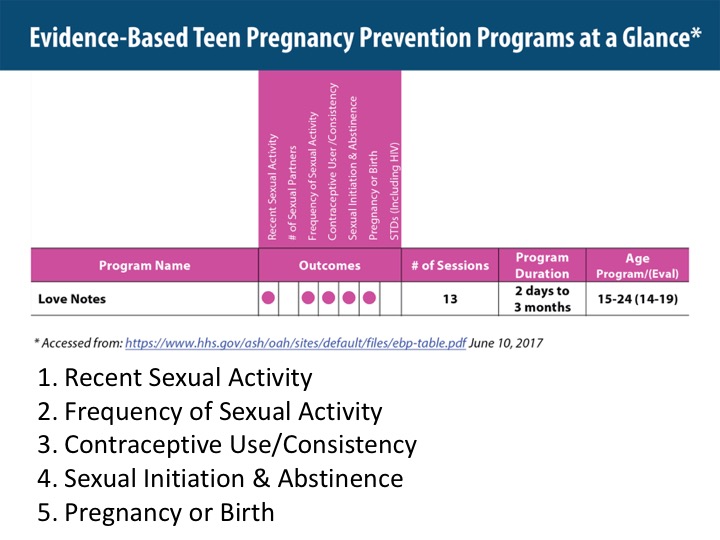 Love Notes is the only evidence based program on the HHS Evidence-Based Teen Pregnancy Prevention Program list that