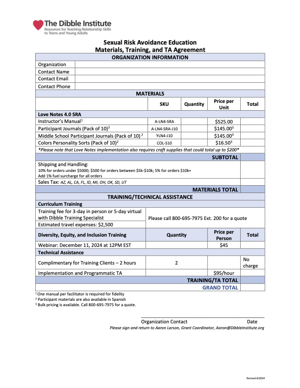 Note: To maintain fidelity, training of your organization’s Love Notes instructors by a Dibble Training Specialist is required.