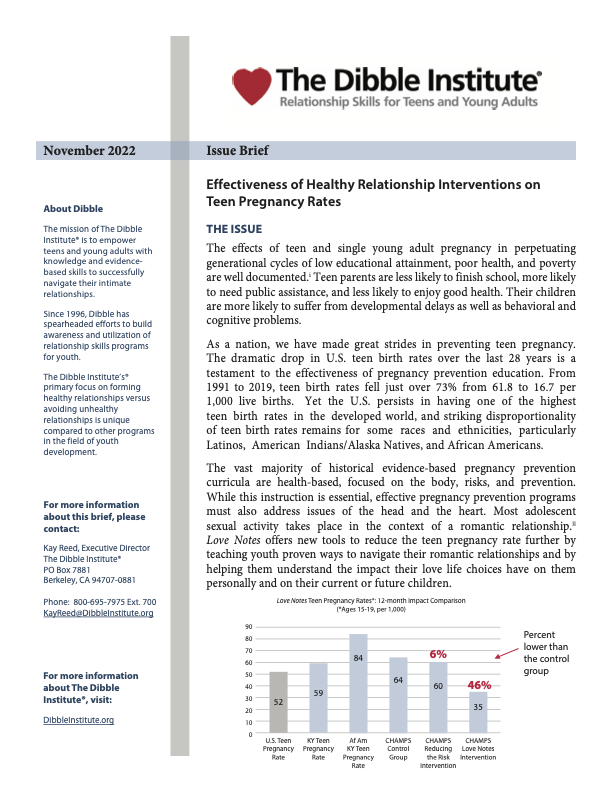 The Dibble Institute is pleased to consult with you as you write your grant and after it has been awarded strategies to sustain your activities over time. We have demonstrated over our nine years of implementing a federal grant, how to bring relationship education cost-effectively to large numbers of youth by using existing community systems.