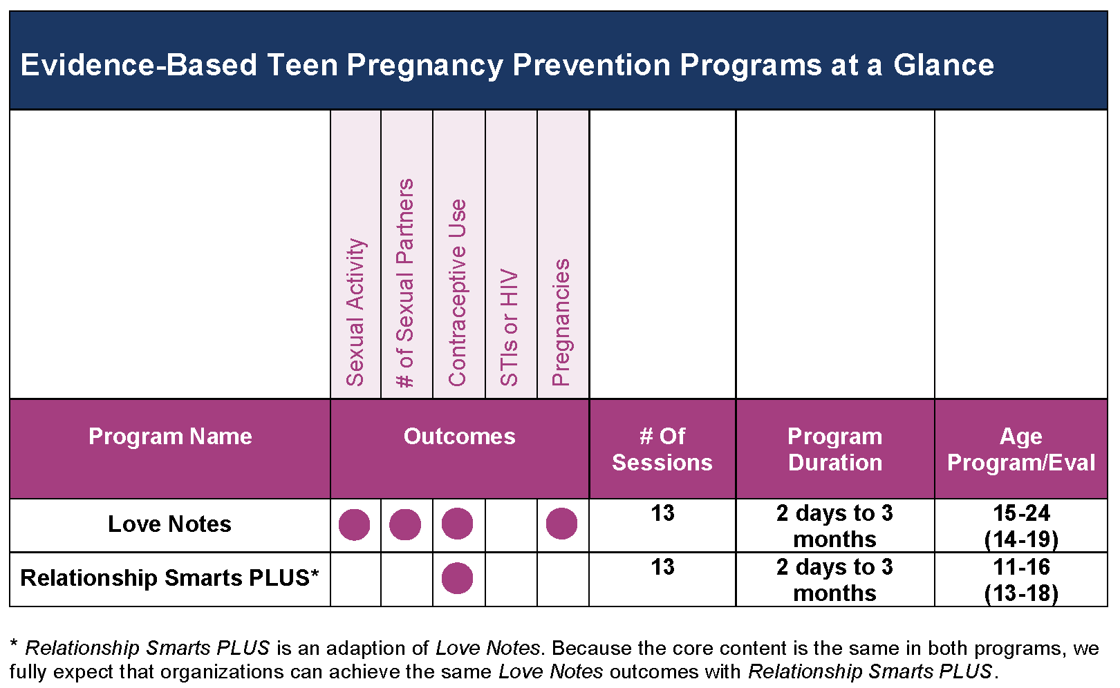 A randomized control trial in Louisville found that 12 months after completing the program young people from the Love Notes intervention were 46% less likely to become pregnant or cause a pregnancy than the control group.